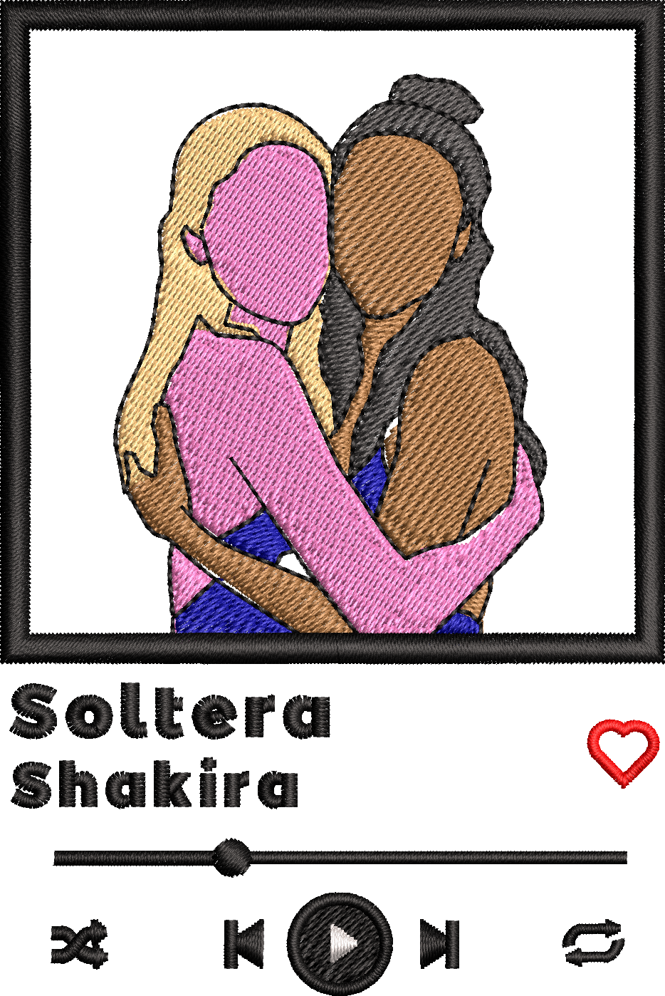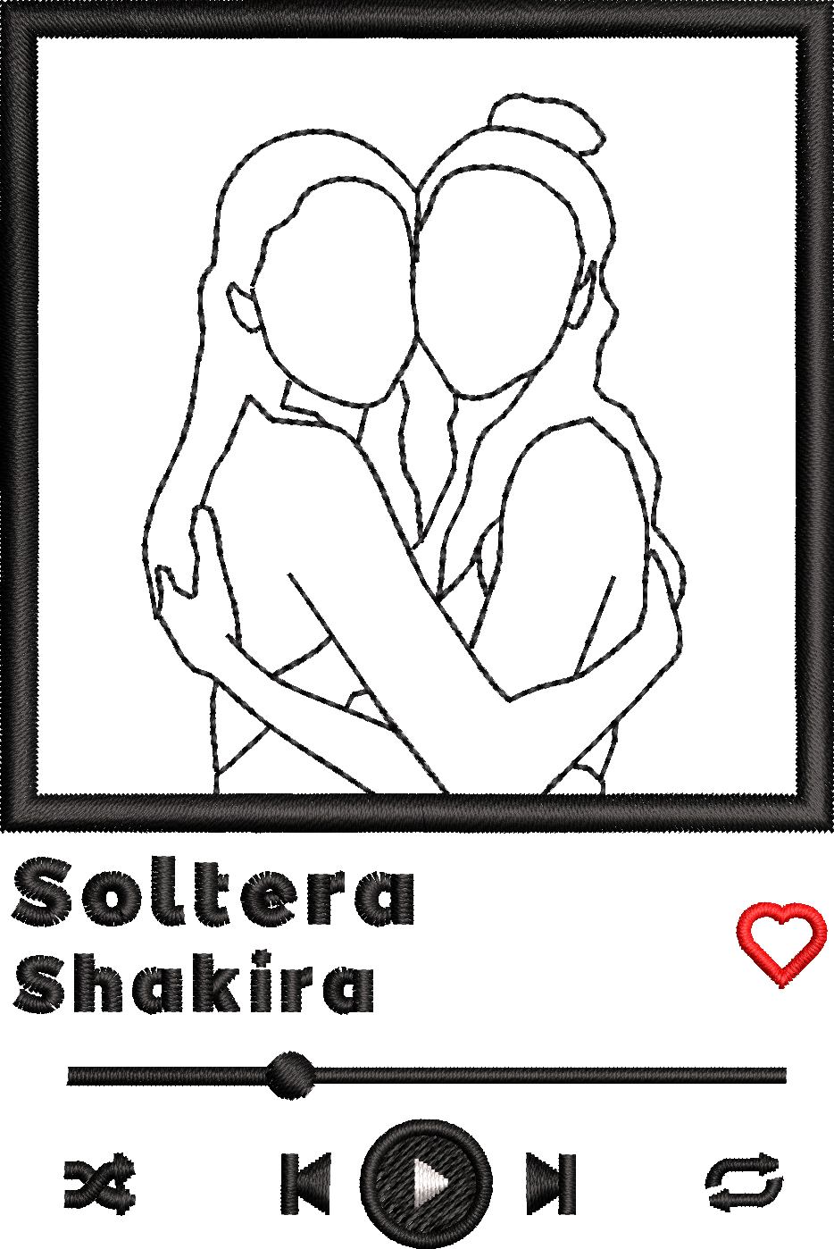 - Tipo de bordado: Bordado reproductor estilo Spotify con retrato personalizado, desarrollado con técnica multitextura y precisión milimétrica para lograr contraste, profundidad y definición.