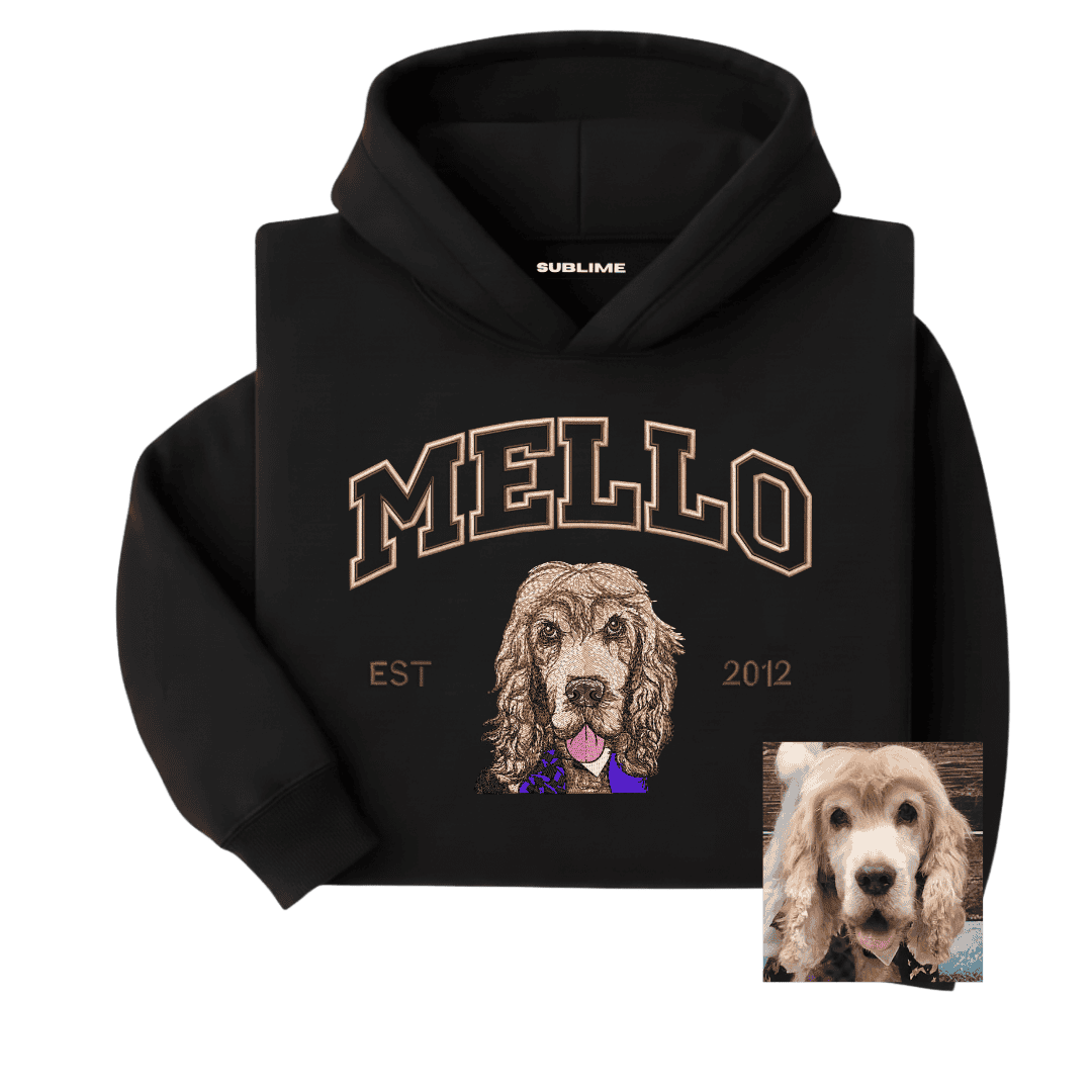 Sudadera premium personalizada con el retrato bordado de tu mascota, su nombre y fecha, creada para conservar lo que más quieres.
